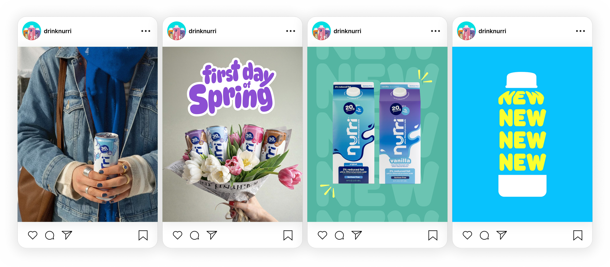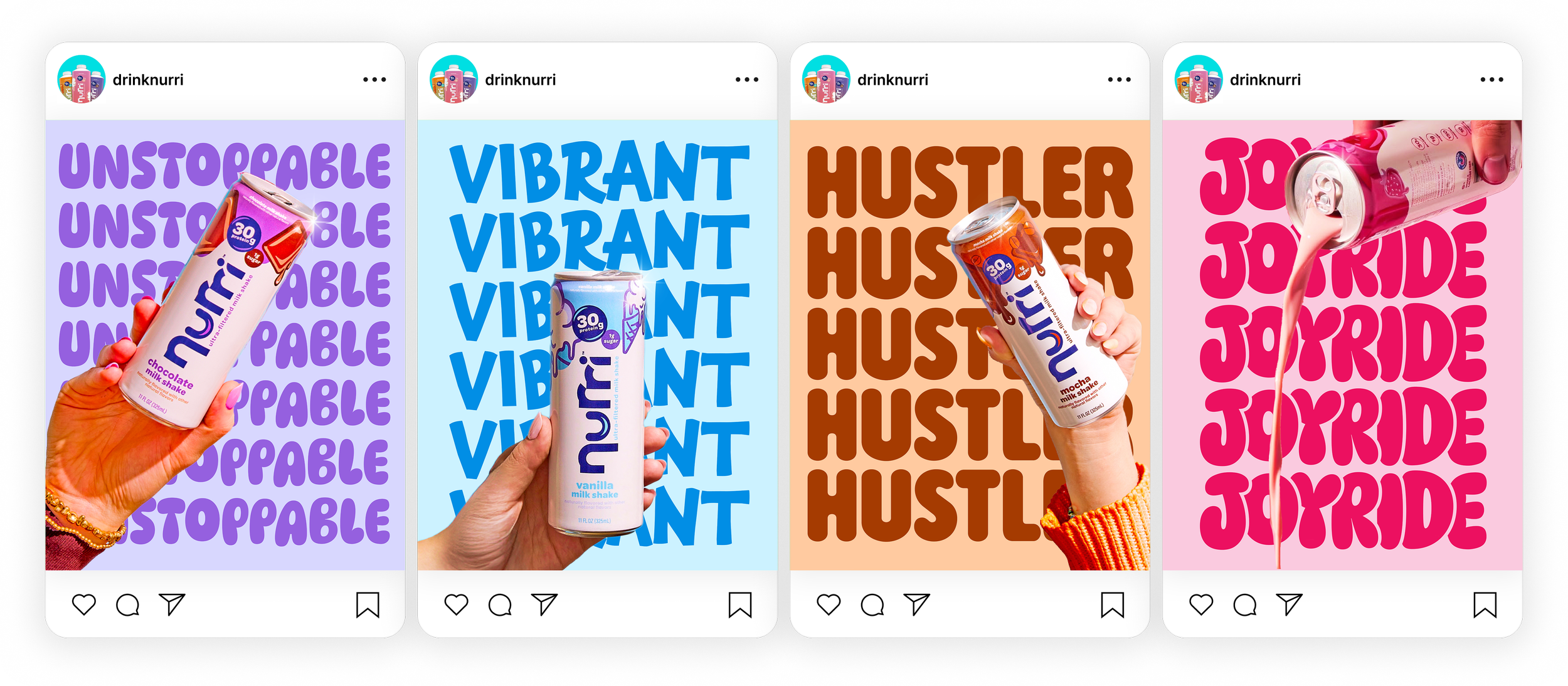 Nurri is an ultra-filtered milk drink packed with protein. This integrated campaign refreshed both the packaging and brand positioning to showcase a playful, vibrant personality that stands out in the saturated protein category.